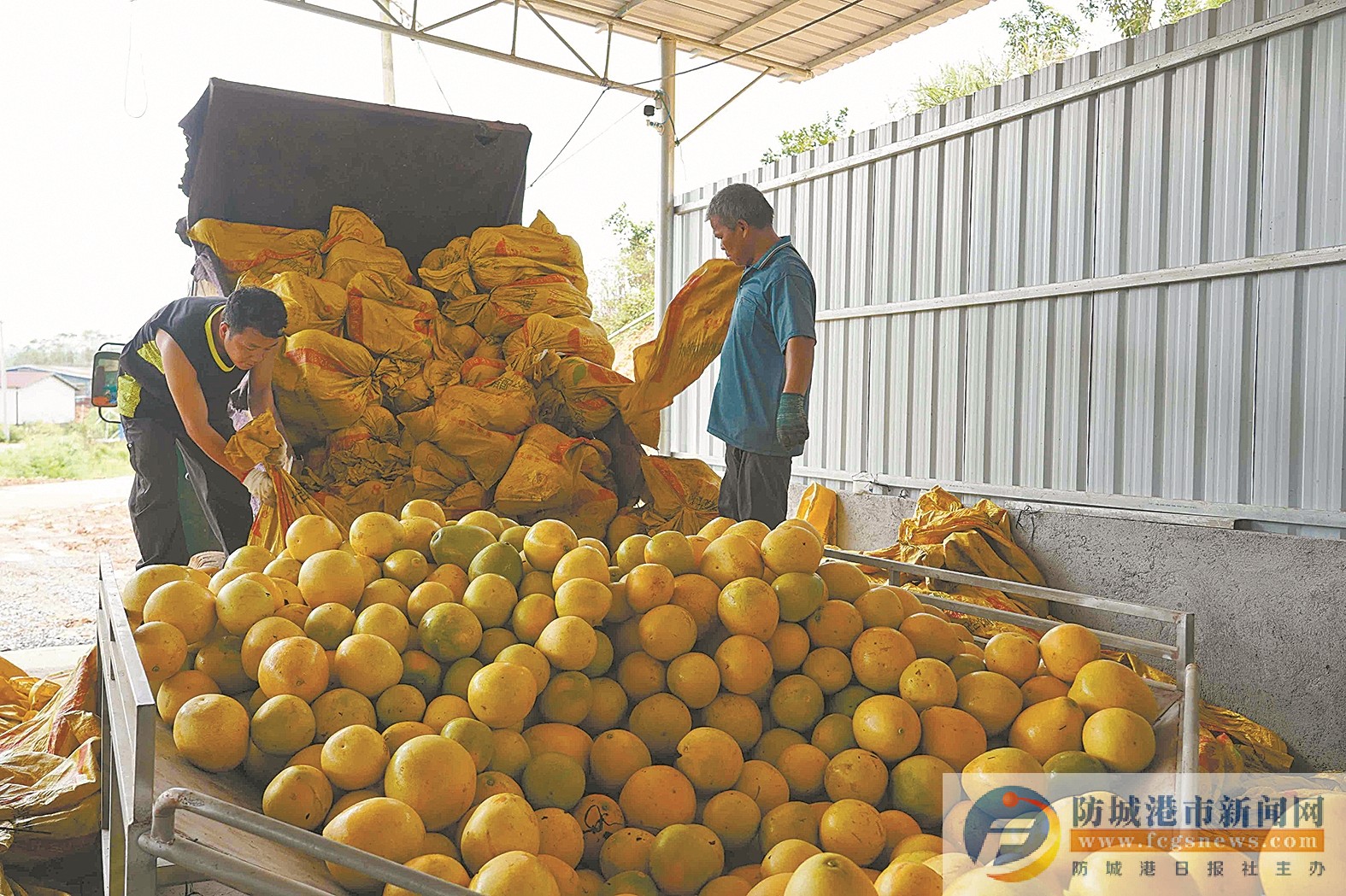 工人装卸三红蜜柚。 韦梅婷 黄琳琳 张 铼 摄