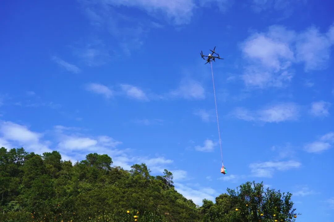 ▲科技赋能陈皮柑采摘,无人机吊运让山林硕果“飞”下山。