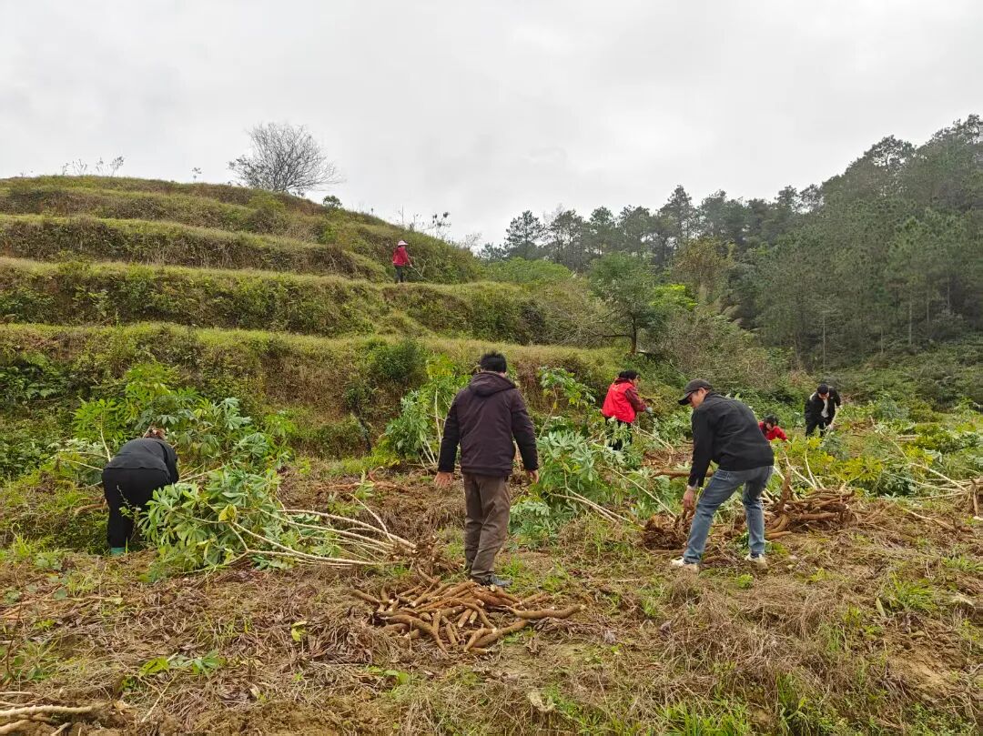 ▲平木村“十姐妹”志愿服务队、包村干部与党员群众一起挖木薯