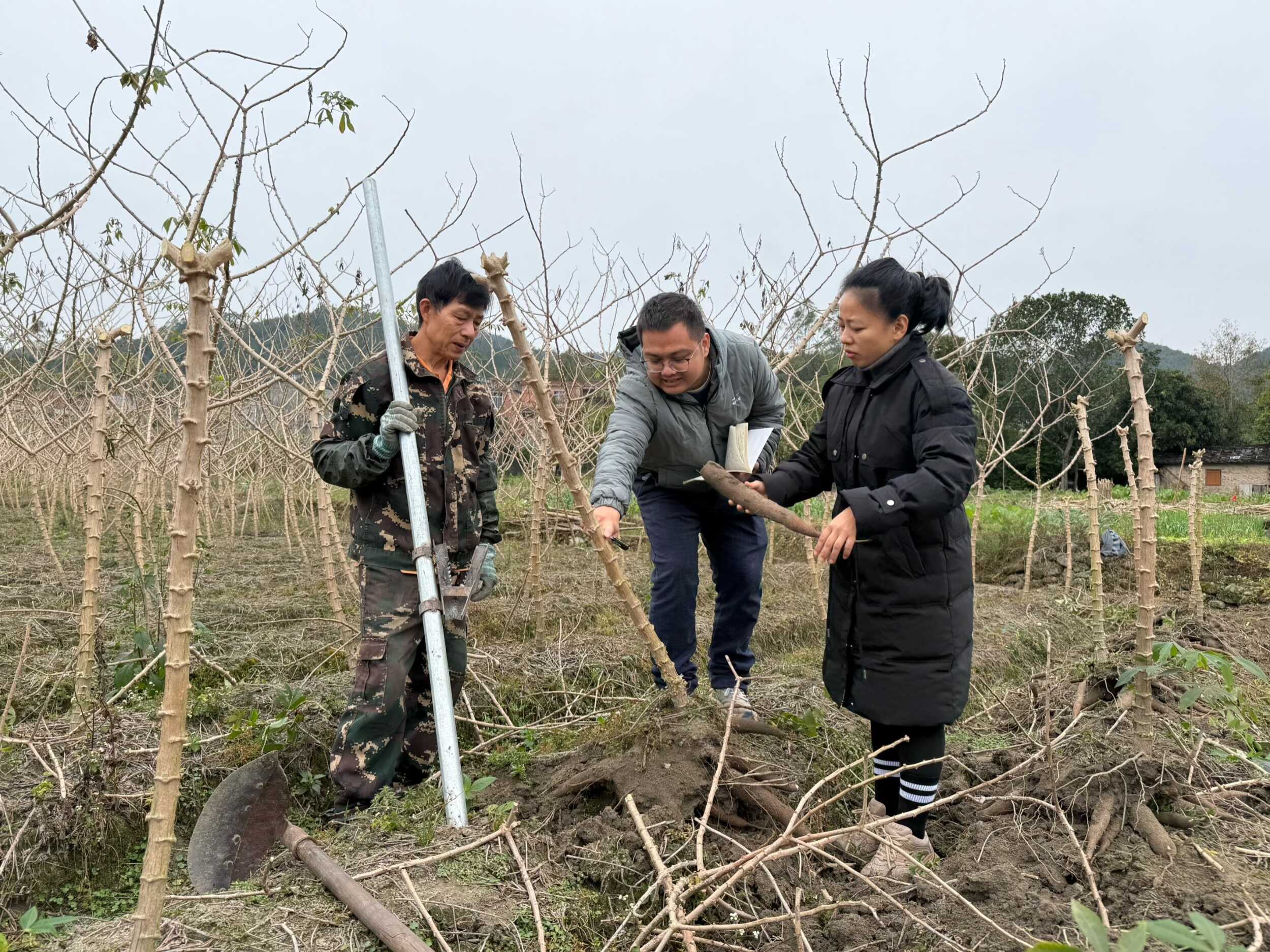 1月23日,防城港市气象局组织业务骨干深入大菉镇木薯种植基地,开展农业气象服务调研。在田间地头,气象技术人员与喜农人、细垌两家合作社的种植户面对面交流,详细询问木薯生长状况、种茎贮藏进度及当前生产中遇到的气象难题,结合近期冷空气活动规律与未来天气趋势,技术人员现场指导种植户落实冬季管护关键措施。