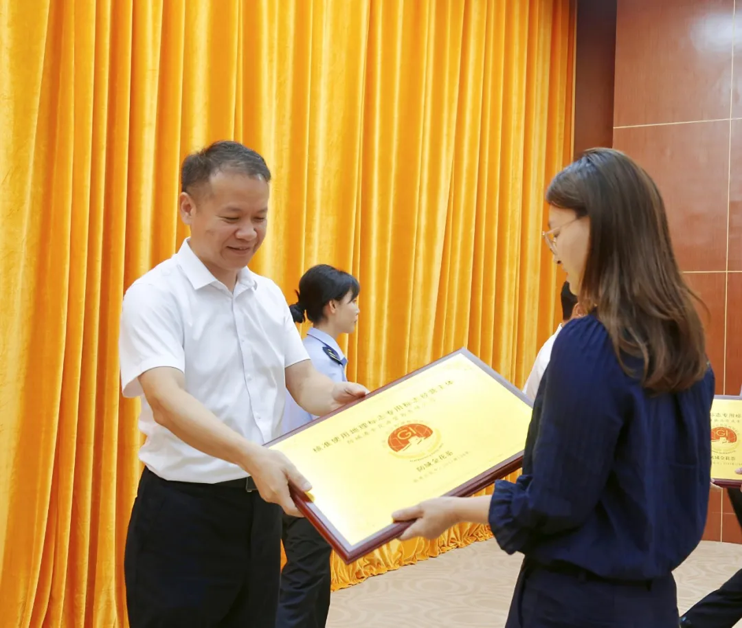 会上,市科技局、市工业和信息化局、医学试验区工作办公室负责同志分别结合部门职能作了发言。会议还为2024年至2025年度获得国家知识产权局核准授权使用防城金花茶、防城肉桂、防城八角地理标志专用标志的9家企业颁发了牌匾。