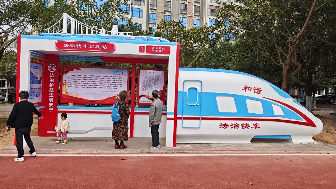 “终点站”以动车车尾造型形成闭环,展示防城港法治建设成果,向市民发出“尊法学法守法用法”倡议,凝聚法治建设合力。