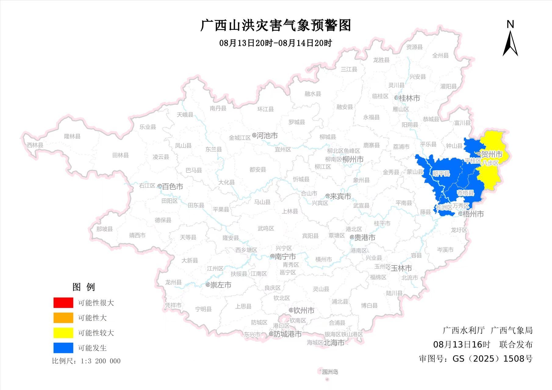预计,08月13日20时至08月14日20时,贺州市东部发生山洪灾害可能性较大(黄色预警),梧州市北部可能发生山洪灾害(蓝色预警)。请各影响区注意做好监测、巡查、预警和转移避险等山洪灾害防范工作。