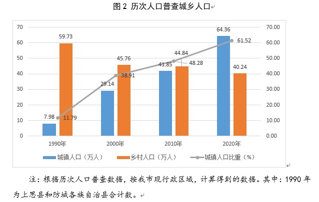 全市常住人口中,居住在城镇的人口为643635人,占61.53%;居住在乡村的人口为402433人,占38.47%。与2010年第六次全国人口普查相比,城镇人口增加了225105人,乡村人口减少了45964人,城镇人口比重提高了13.25个百分点。