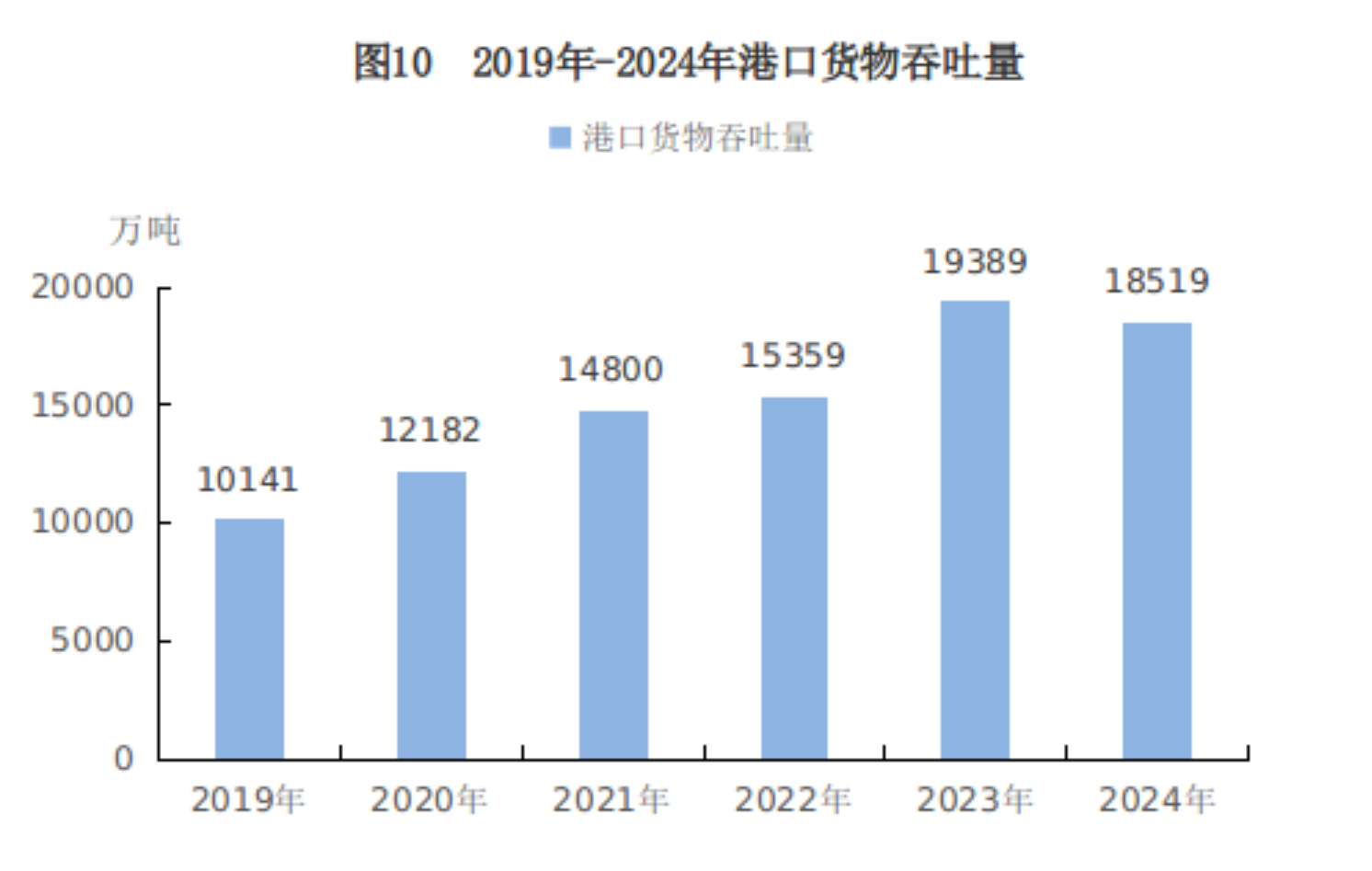 全年港口货物吞吐量18519万吨,比上年下降4.5%。集装箱吞吐量100.50万标准箱,增长7.8%。从货物贸易方式看,外贸货物吞吐量11537万吨,增长2.3%;内贸货物吞吐量6981万吨,下降14.0%。从商品主要种类看,完成吞吐量前五位货种分别为:金属矿石6568万吨,煤炭及制品3871万吨,钢铁2227万吨,非金属矿石2130万吨,矿建材料1612万吨。