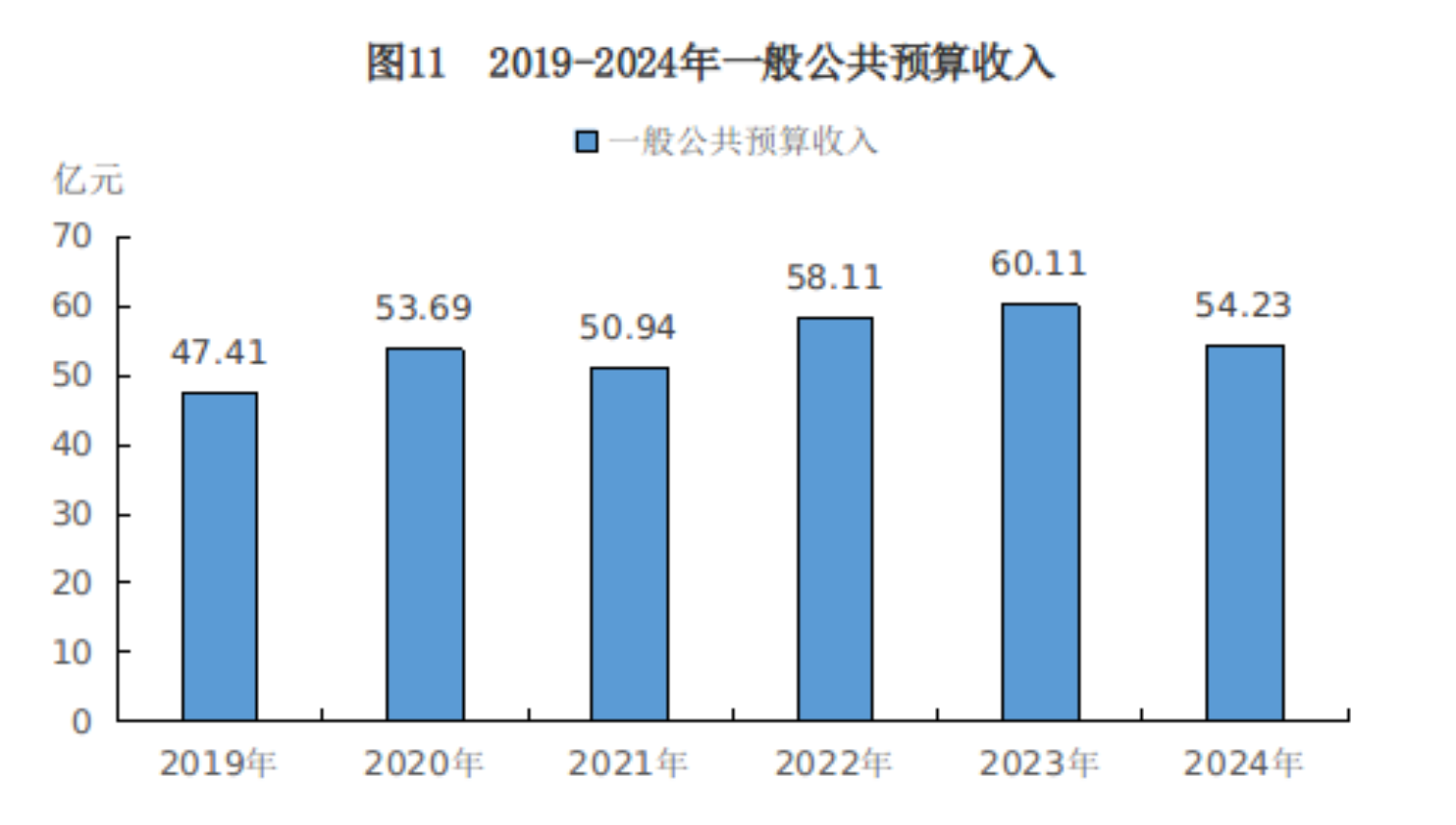 全年一般公共预算收入54.23亿元,比上年下降9.8%。其中,税收收入32.65亿元,下降2.7%;非税收入21.58亿元,下降18.7%。一般公共预算支出162.19亿元,增长1.0%。其中民生重点领域支出120.85亿元。重点支出情况如下:城乡社区支出21.11亿元,增长30.8%;农林水支出18.35亿元,增长23.0%;科学技术支出2.37亿元,增长1.0%。