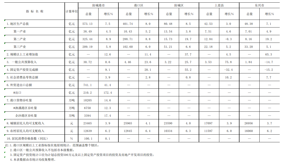 2025年上半年防城港市及各县(市、区)主要经济指标完成情况表