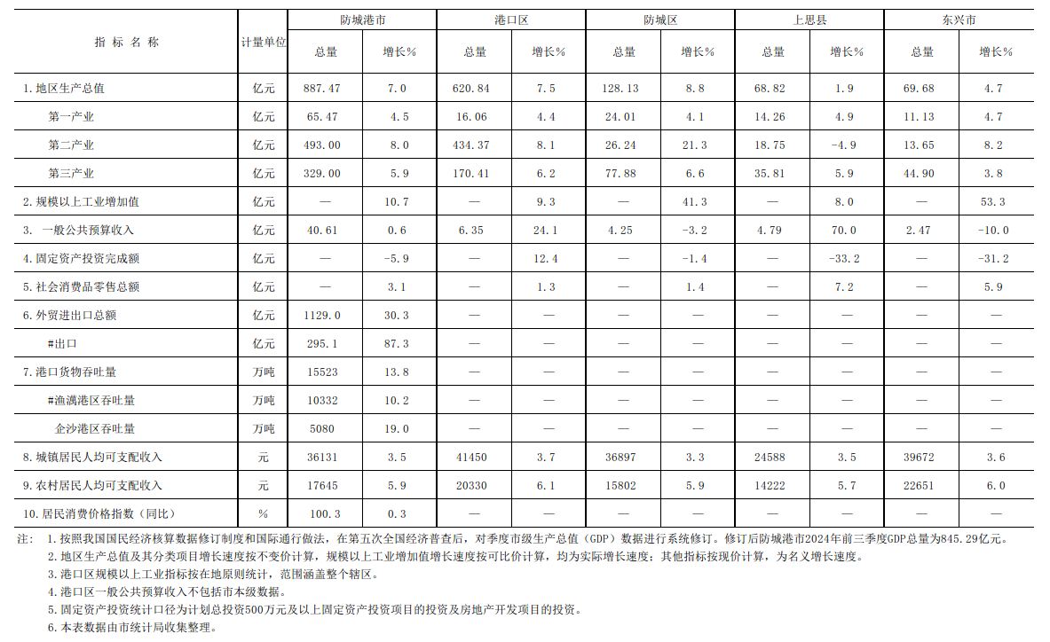 2025年前三季度防城港市及各县(市、区)主要经济指标完成情况表