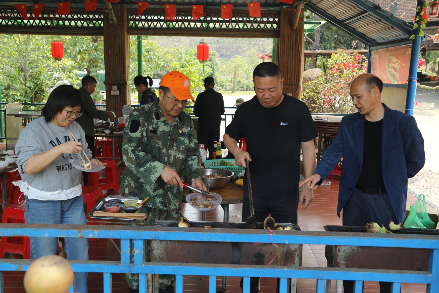 清扫完环境卫生,大家前往红色教育基地——东兴陈公馆景区。在讲解员的带领下,参观了历史展览,聆听了陈济堂的事迹。一幅幅珍贵的历史图片、一件件斑驳的文物,仿佛将大家带回到那段波澜壮阔的革命岁月。军休干部们神情庄重,认真聆听讲解,不时驻足凝视,感慨万千。他们深刻感受到今天的幸福生活来之不易,更加坚定了为党和人民的事业继续贡献力量的决心。参观完红色教育基地,大家来到东兴长湖生态园,开展春日生态游活动。军休人员进行生态徒步走。沿着蜿蜒的山间小路前行,春风拂面,鸟语花香,春日美景尽收眼底。大家一边欣赏自然风光,一边交流着活动的感受,欢声笑语回荡在山间。随后,参观了特色农业观光园,了解现代化农业的特点。在采摘园里,大家亲手采摘番茄、青枣,体验劳动的乐趣。“窑鸡DIY”环节更是将活动气氛推向高潮,大家分工合作,有的拾柴生火,有的处理食材,有的涂抹调料。当香喷喷的窑鸡出炉时,大家围坐在一起,分享着美食,享受着春日的美好时光。