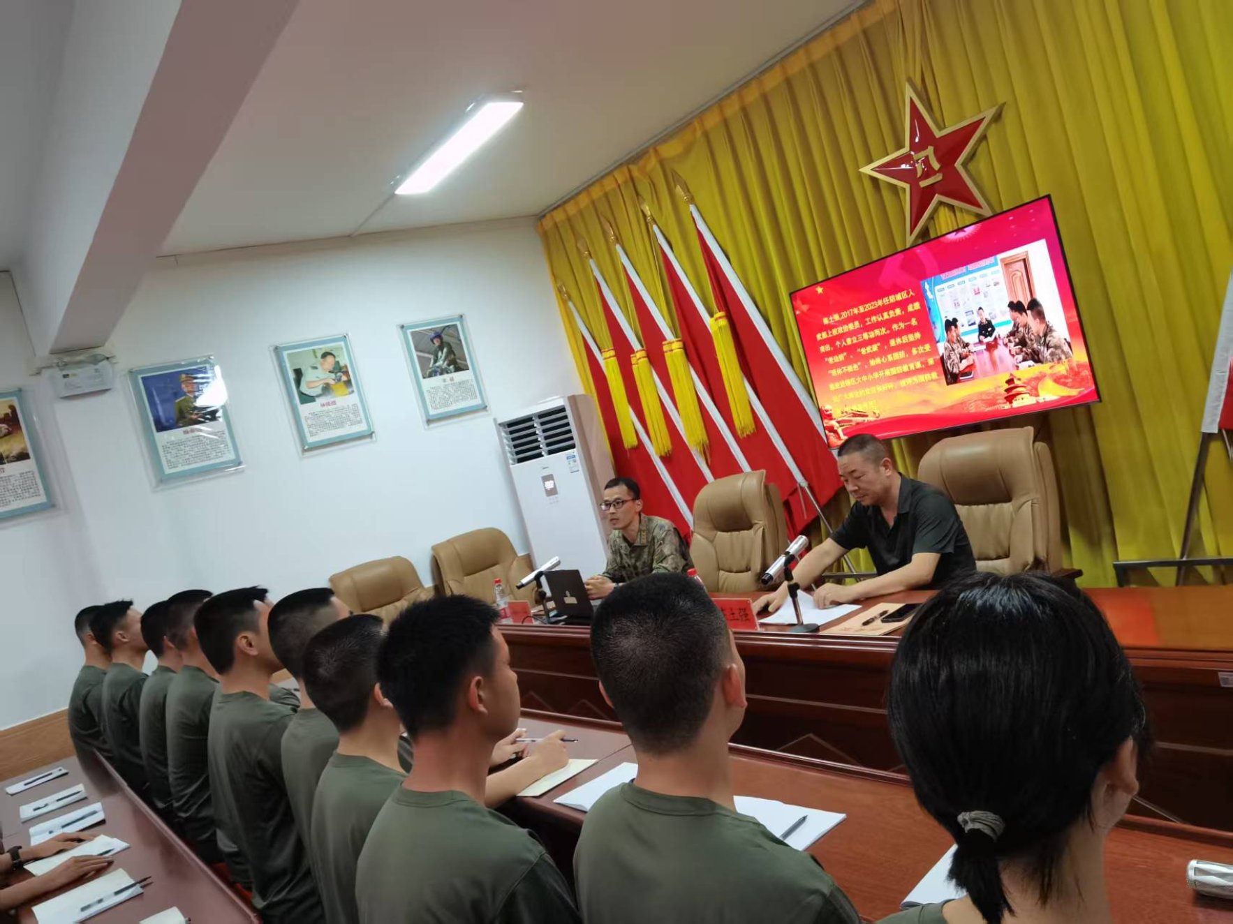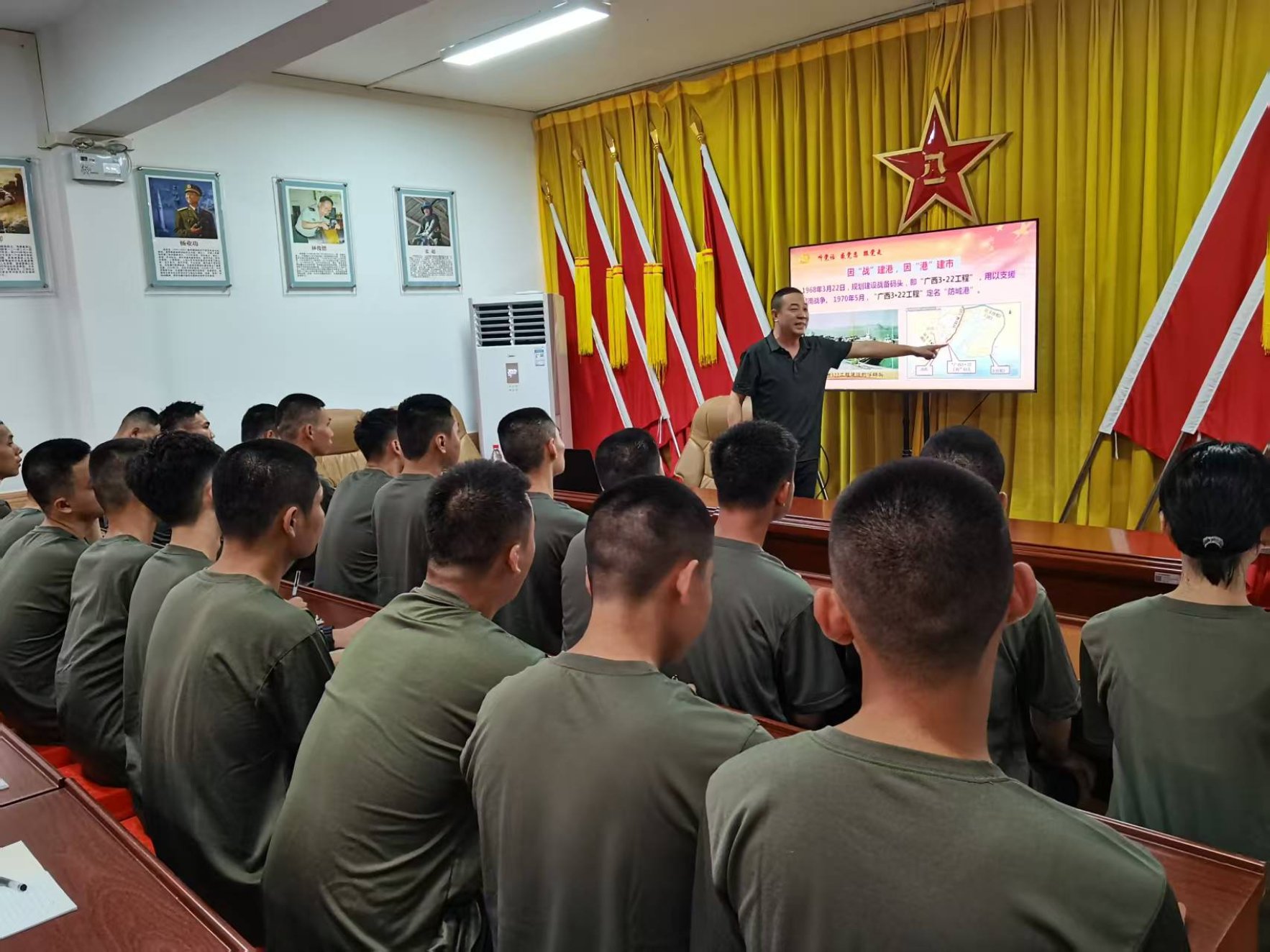 陈政委首先讲述了防城作为边关重镇的历史地位。“防城地处祖国南疆,有着悠久的戍边文化和光荣的革命传统。”他通过珍贵的历史照片和详实的史料,向新兵们展示了防城在新民主主义时期的革命历程。“1927年1月,防城县第一个党组织——中共东兴支部成立,从此红色火种在这片边关热土上燎原。”陈政委深情地讲述着革命先辈的奋斗故事,新兵们全神贯注,仿佛回到了那个烽火连天的岁月。