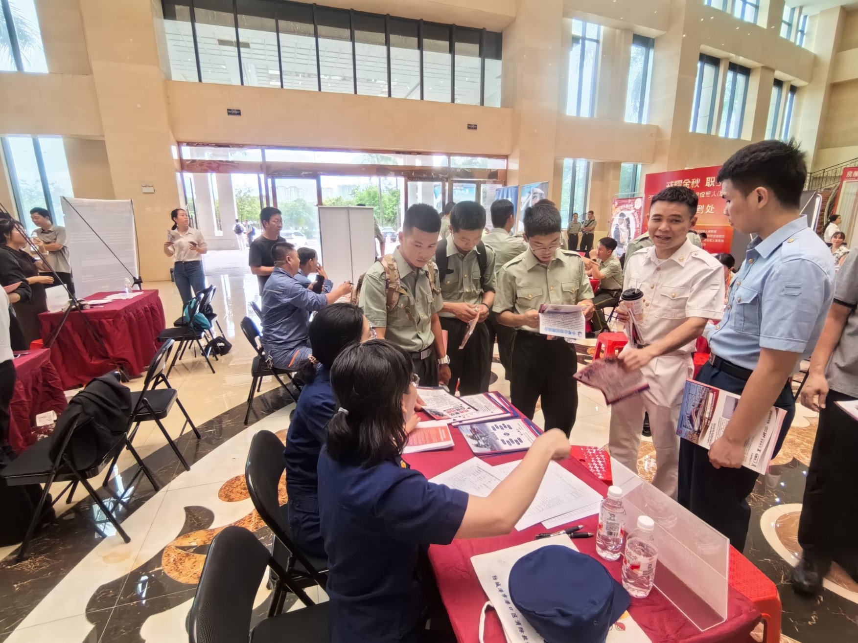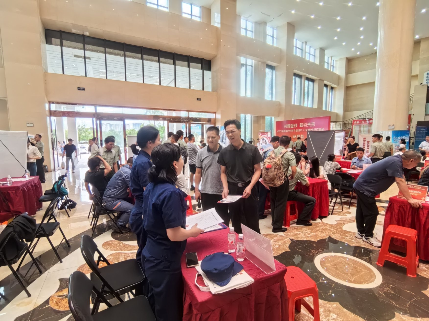 下午三点起,退役军人及军属陆续抵达现场。入口处设置的签到区背景板醒目大气,工作人员热情引导签到并发放饮用水,细致介绍参会企业位置及招聘流程。现场悬挂着“戎装虽卸志不改,金秋职场再显才”“老兵逐梦金秋里,军属就业暖心间”等励志横幅,配合彩色刀旗和主题展板,营造出庄重而温馨的招聘氛围。