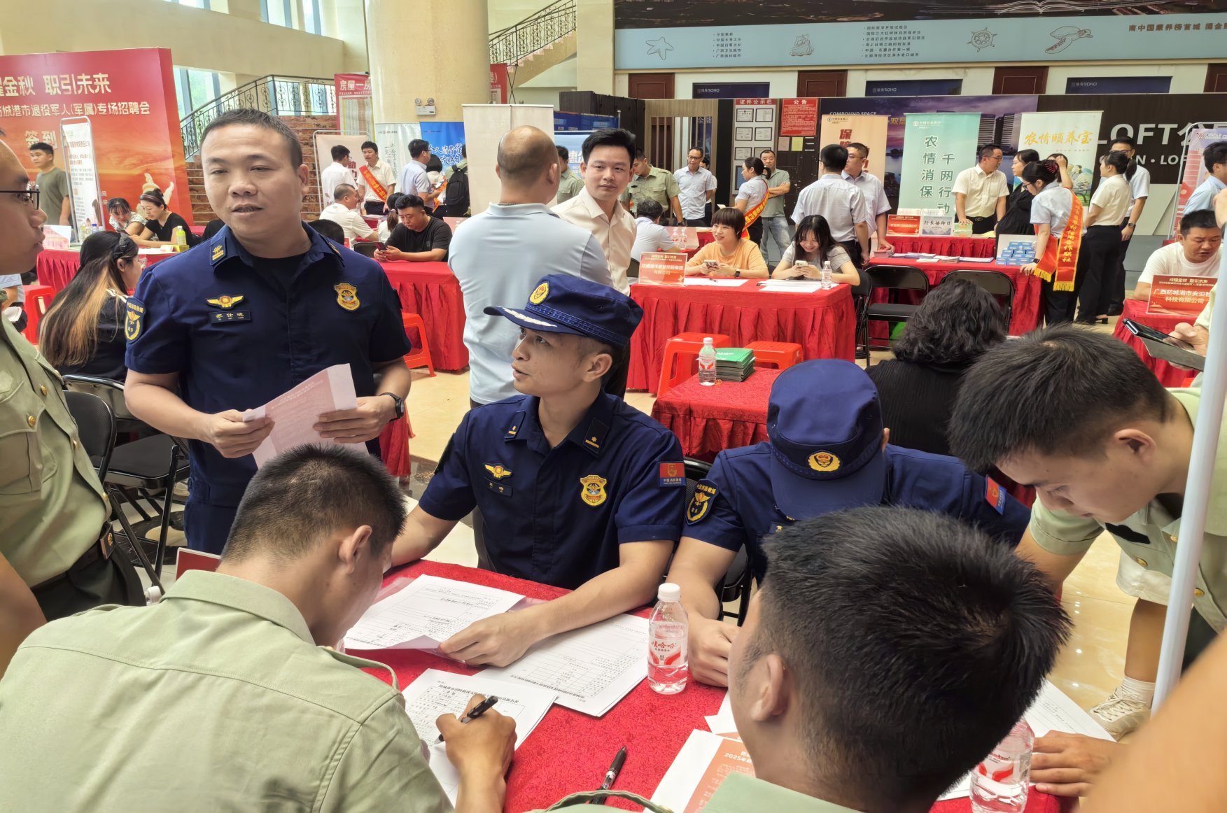 场内共设30个标准招聘展位,参加招聘单位企业44家,涵盖市公安局、边境管理支队、消防救援支队、港务局、机电学校以及多家国有企业和重点制造业、物流企业等,提供包括安全管理、技术操作、行政文员、驾驶运输等近1000余个岗位,贴近退役军人技能特点与就业需求。每个展位配备定制台卡、桌椅及装饰气球,企业招聘人员早早到位,与求职者面对面深入交流。