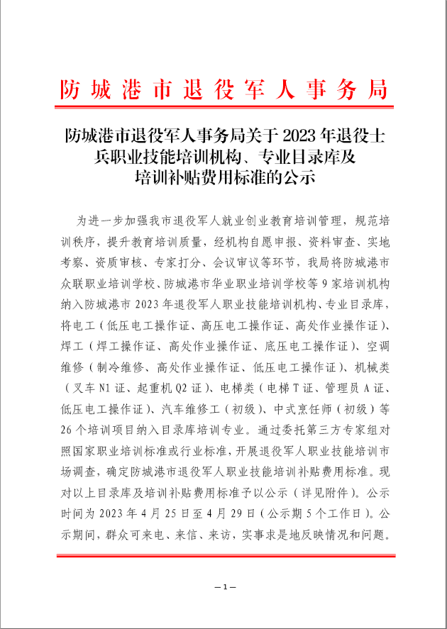 市退役军人事务局关于2023年退役士兵职业技能培训机构、专业目录库及培训补贴费用标准的公示