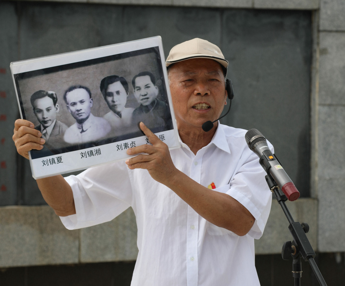 黄文良在港口区“三光企”革命武装起义纪念碑讲述“三光企”起义光辉历史
