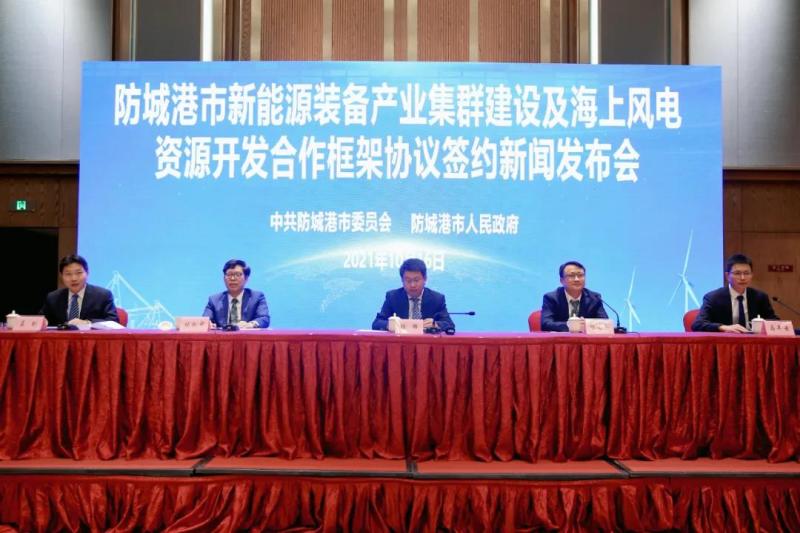中共防城港市委员会、防城港市人民政府于2021年10月16日(星期六)上午11:40,在南宁荔园维景国际大酒店B2层荔景厅召开防城港市新能源装备产业集群建设及海上风电资源开发合作框架协议签约新闻发布会。邀请防城港市委常委、市人民政府常务副市长,市政府新闻发言人陆辉;广投能源集团党委副书记姚若军;明阳新能源投资控股集团有限公司高级副总裁张献中;中国广核新能源控股有限公司广西分公司总经理马丰云介绍有关情况并回答记者提问。发布会由市委宣传部副部长、市委网信办主任,市政府新闻发言人蓝剑主持。