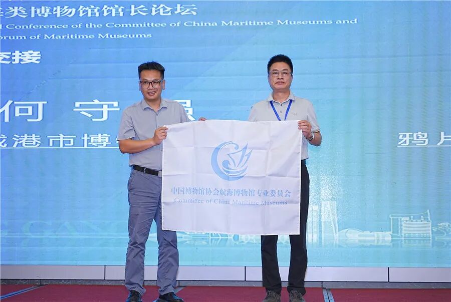 本届年会承办单位防城港市博物馆馆长何守强与下届年会承办单位鸦片战争博物馆副馆长孙广平进行了海专委会旗交接,孙广平副馆长接旗后代表下届承办单位作了发言。
