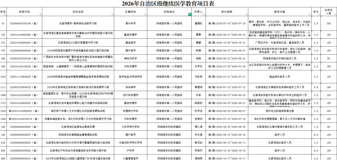 近日,广西继续医学教育工作委员会公布《广西壮族自治区继续医学教育工作委员会关于公布2026年自治区级继续医学教育项目的通知》(桂卫继字〔2026〕1号),我市共有37个项目成功获批,立项数创历史新高,标志着我市继续医学教育能力建设取得新突破。具体名单如下: