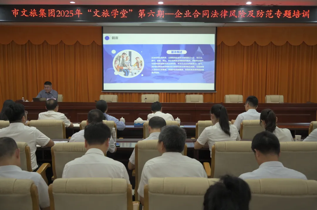 近日,市文旅集团举办2025 年 “文旅学堂” 第六期,此次培训聚焦企业合同法律风险及防范,邀请广西欣和律师事务所李建新律师授课。集团领导班子成员、公司各部门、各子公司业务骨干约 50 人参加培训。