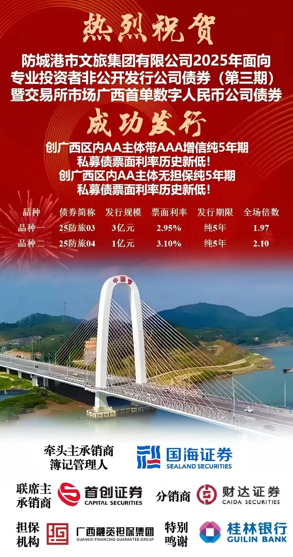 11月25日,防城港市文旅集团 2025 年面向专业投资者非公开发行公司债券(第三期)在上海证券交易所成功发行。值得关注的是,本期债券不仅是广西首单在交易所市场发行的数字人民币公司债,更是防城港市作为 “面向东盟的跨境贸易数字人民币试点城市”,在债券融资领域的首次创新实践,创下纯5年期私募债利率历史新低。这标志着市文旅集团在运用数字金融工具创新融资手段、服务跨境贸易与高质量发展进程中取得了新的突破。