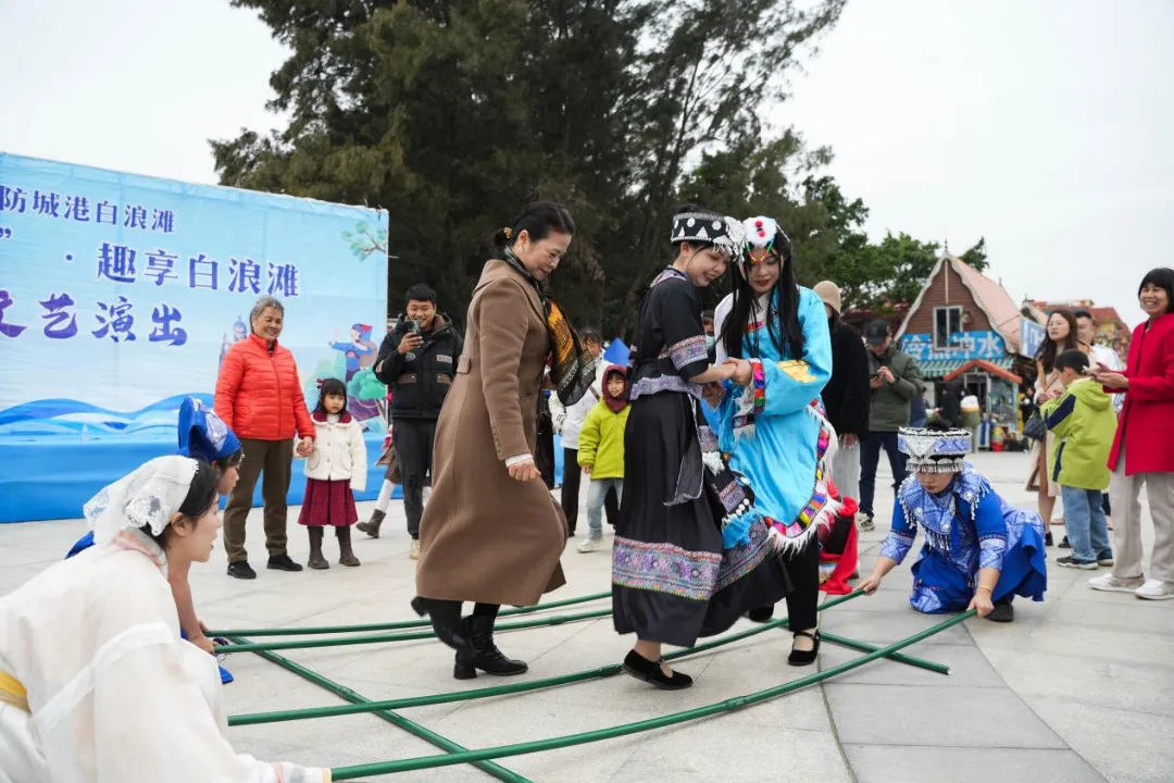 创新编排的国潮舞蹈《哪吒》《敖丙》为传统节日注入了潮流活力,哪吒、敖丙人偶“破壁”互动,颇受孩童欢迎。山歌对唱、绣球传福、竹竿舞等民俗互动体验感强,五色糯米饭、艾叶糍粑、发糕等非遗美食满足了味蕾,舞者们身着壮族、瑶族、京族绚丽多彩的民族服饰载歌载舞,让人目不暇接……来自云南、贵州、四川、湖南等地游客“沉浸式”体验民族文化独特韵味。各民族游客笑声、歌声、欢呼声与黑沙白浪交相辉映,映照出民族团结幸福花。