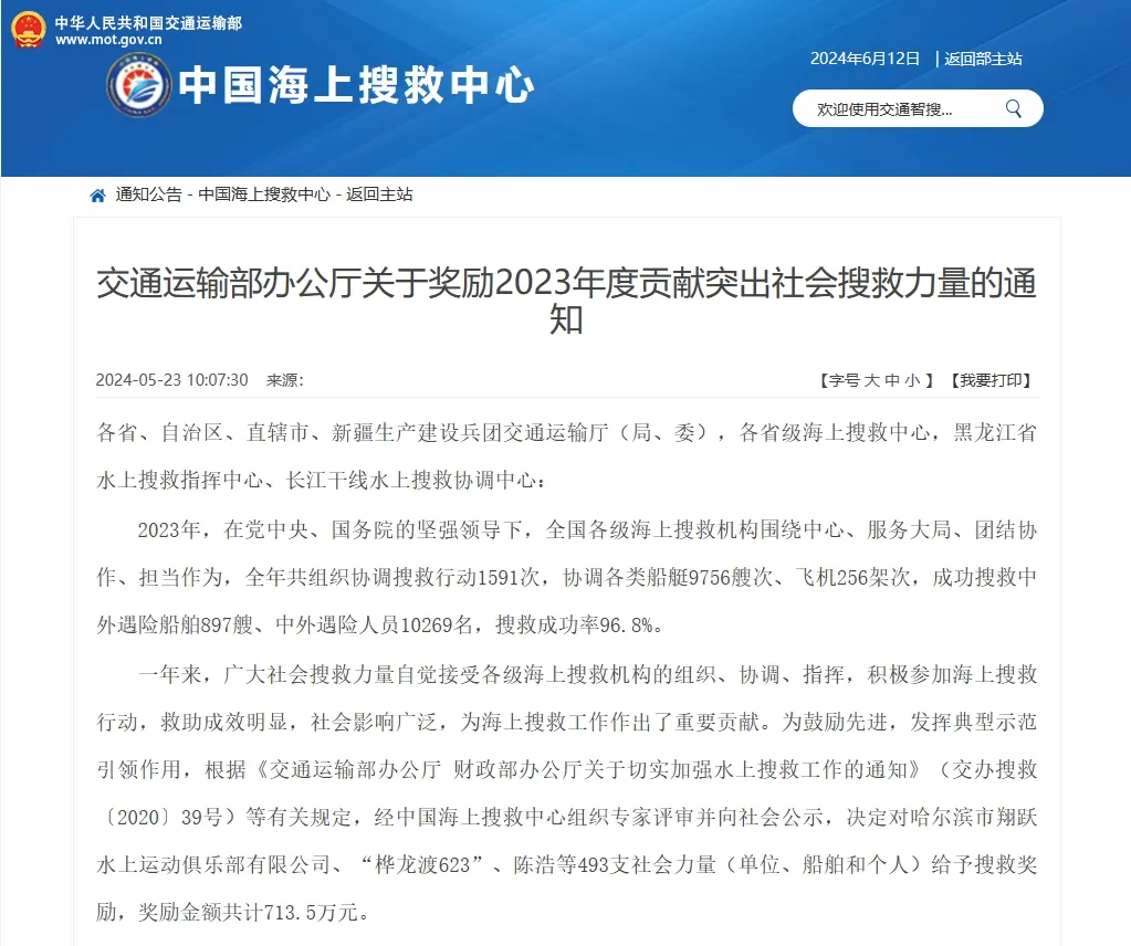 近日,市文旅集团下属防城港北部湾旅游投资开发有限公司(以下简称北旅投公司)荣获交通运输部办公厅颁发的2023年度国家海上搜救奖励,这是北旅投公司第二次获此殊荣。
