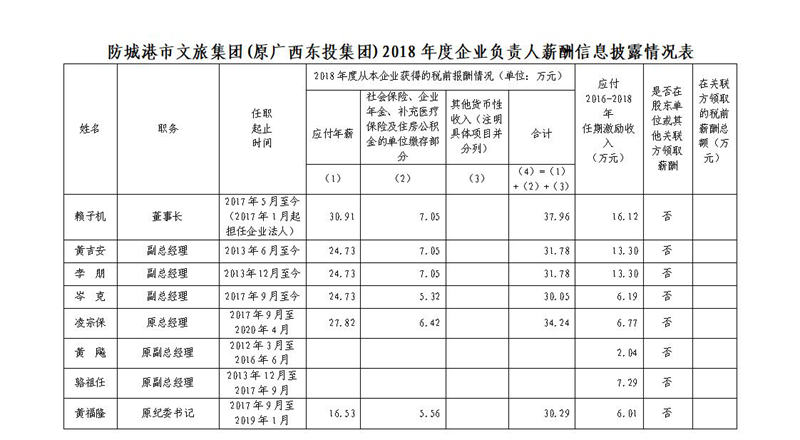 根据中央及自治区深化国有企业负责人薪酬制度改革的相关要求,现将防城港市文旅集团有限公司(原广西东投集团有限公司)企业负责人2018年度薪酬信息披露如下: