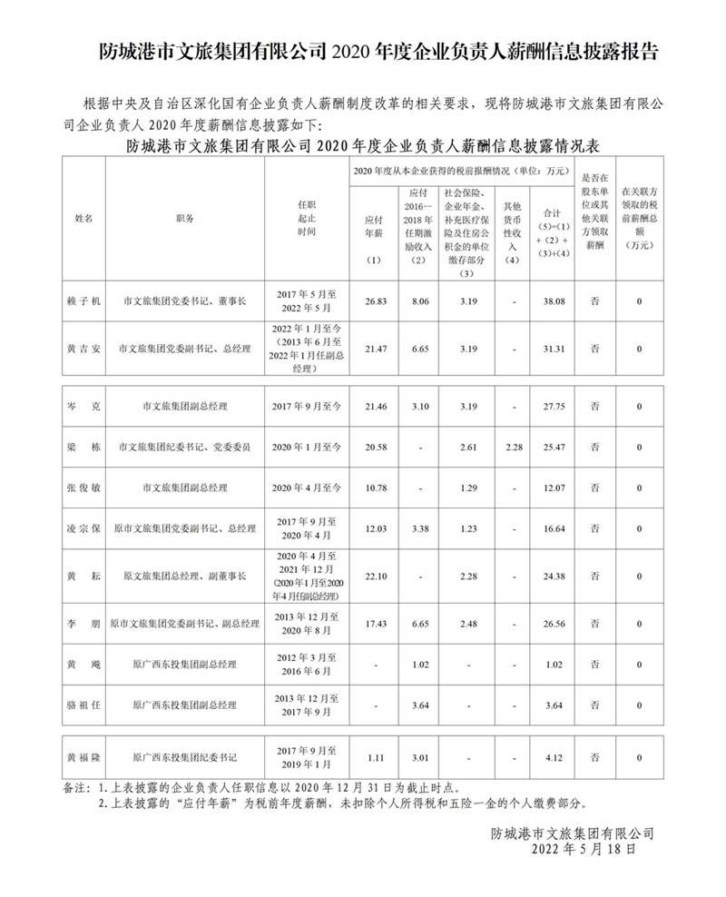 防城港市文旅集团有限公司2020年度企业负责人薪酬信息披露报告