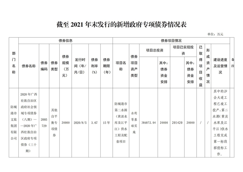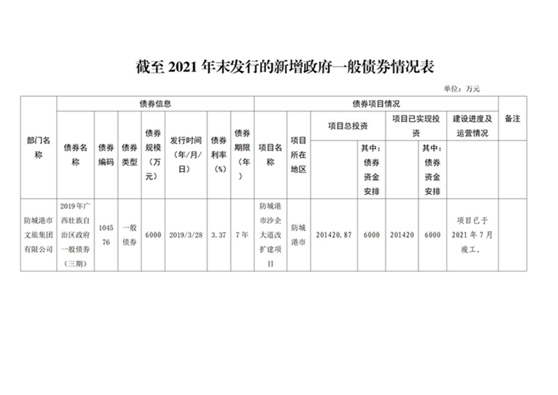 防城港市文旅集团有限公司截止2021年末新增政府债券存续期内信息公开
