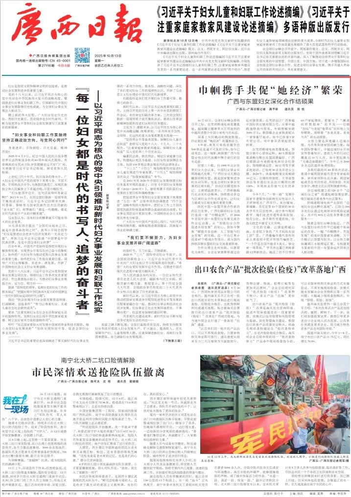 随着全球妇女峰会临近,广西与东盟妇女的合作早已超越个体命运的改变,一幅“巾帼携手、共促发展”的美好图景愈发清晰。万千巾帼正以智慧与担当,让女性力量如澜湄江水般绵延汇聚,为构建更为紧密的中国—东盟命运共同体注入新动能。
