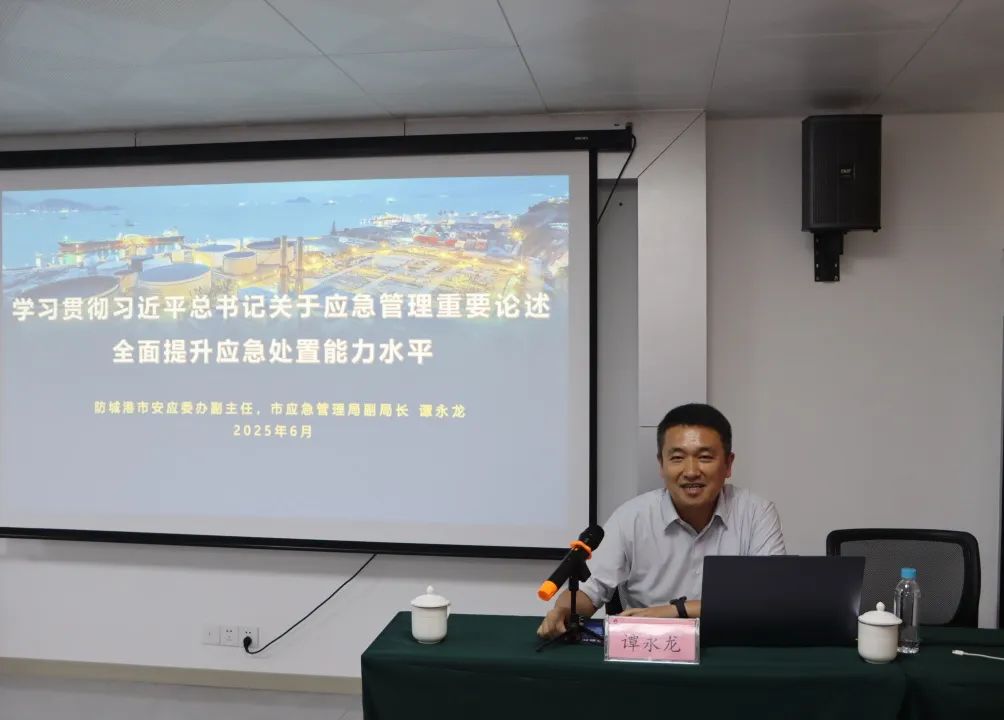 2025年6月25日,市兴港集团举办“安全生产月”专题安全培训班,邀请防城港市安全生产和应急管理委员会办公室副主任、市应急管理局副局长谭永龙授课,培训课程涵盖习近平总书记关于安全生产的重要论述和重要指示批示精神、《中华人民共和国安全生产法》和《地方党政领导干部安全生产责任制规定》解读、安全事故警示、防范化解重大安全风险等内容。集团党委委员、副总经理,集团各部(室)负责人、集团各子公司主要负责人、分管安全副总、安全管理部门全体人员以及业务部门负责人参加了培训班。