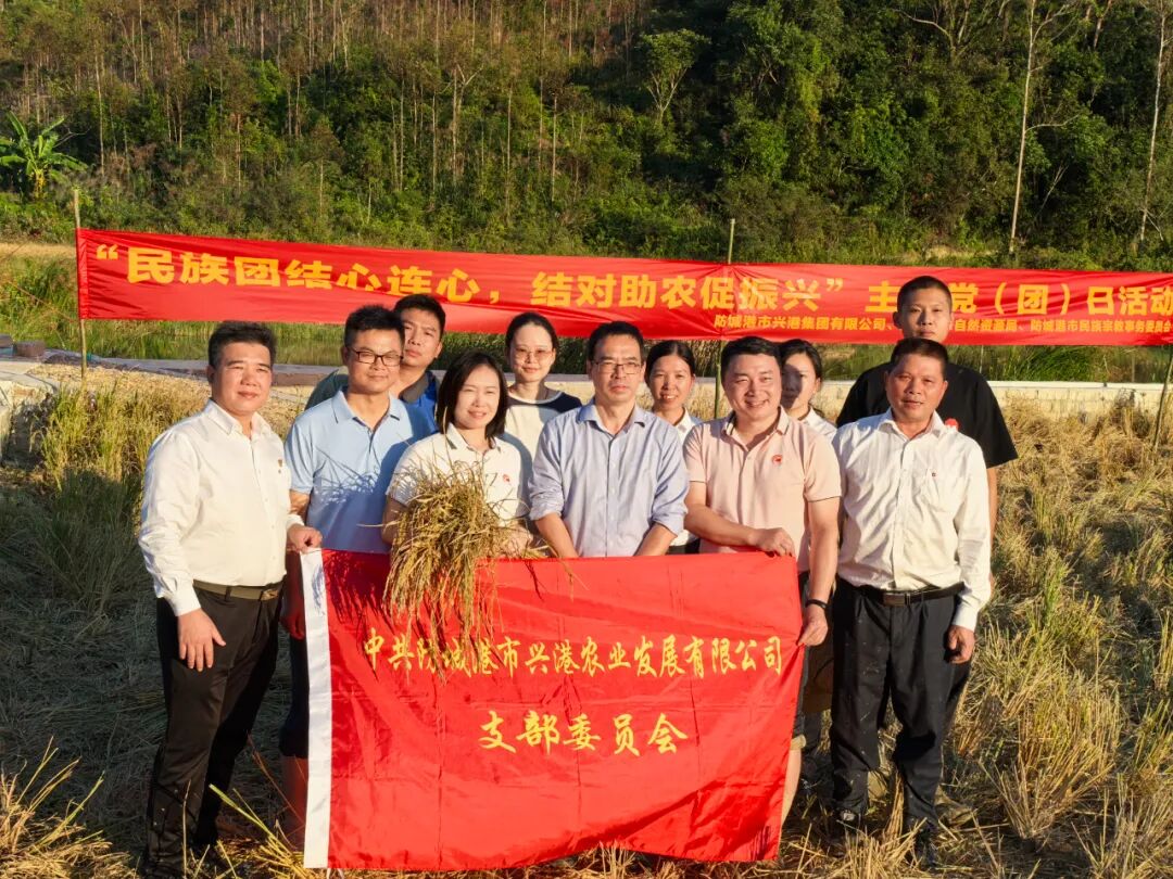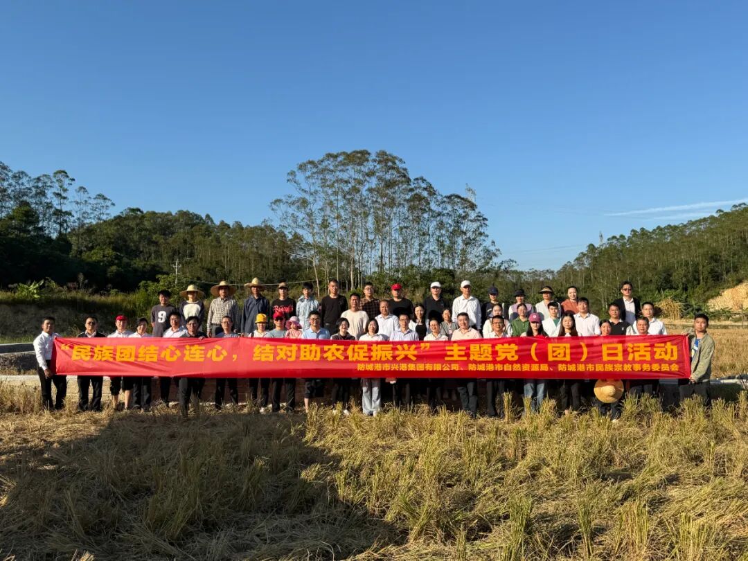 金秋时节,稻浪翻滚,稻谷收割正当时!为深入学习贯彻党的二十届四中全会精神,弘扬艰苦奋斗、勤俭节约的优良传统,铸牢中华民族共同体意识,11 月 14 日下午,市兴港集团党委与下属市兴港农业公司联合多个市直单位,在港口区光坡镇彭公角村牛角冲大岭开展 “民族团结心连心,结对助农促振兴” 主题党(团)日活动,50 余名党员、志愿者共同投身稻田,用实干助力丰收。