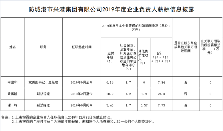 防城港市兴港集团有限公司2019年度企业负责人薪酬信息披露