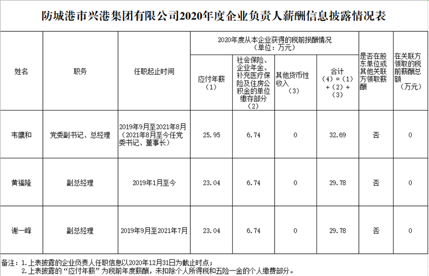 防城港市兴港集团有限公司2020年度企业负责人薪酬信息披露情况表
