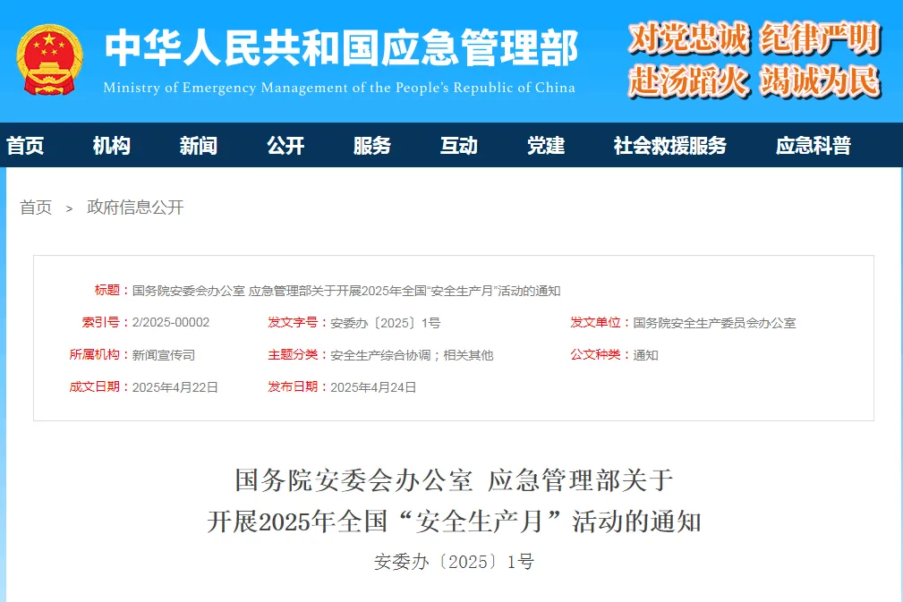 今年6月是第24个全国“安全生产月”,主题是“人人讲安全、个个会应急——查找身边安全隐患”,6月16日为全国“安全宣传咨询日”。为组织做好2025年全国“安全生产月”各项工作,现就有关事项通知如下: