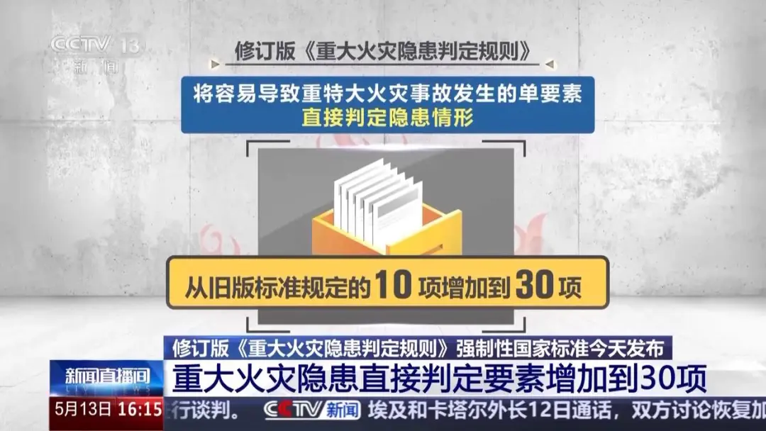 据新华社消息,5月13日,市场监管总局(国家标准委)会同应急管理部联合举办防灾减灾救灾和安全生产领域重要国家标准新闻发布会,介绍近期发布的《重大火灾隐患判定规则》等一批重要国家标准有关情况。重大火灾隐患判定事关人民群众生命财产安全和切身利益。据介绍,新修订的《重大火灾隐患判定规则》强制性国家标准,建立了火灾隐患分级判定体系,通过量化指标和动态评估模型,实现隐患早识别、早预警,筑牢消防安全防线。国家消防救援局政策法规司一级指挥长鲁云龙介绍,此次修订强制性国家标准《重大火灾隐患判定规则》主要目的是落实国务院安委会有关工作部署,在总结2017版标准实施经验基础上,全面吸取火灾事故教训,丰富重大火灾隐患判定要素,进一步提高标准的操作性。鲁云龙说,新版标准的执行需要注意区分重大火灾隐患与一般火灾隐患可能导致后果的差异,准确理解和适用重大火灾隐患判定规则,力求判定结论科学合理,通过主动前移火灾防控关口,筑牢消防安全底线。一是增加了重大火灾隐患的直接判定要素,将容易导致重特大火灾事故发生的单要素直接判定隐患情形,从旧版标准规定的10项增加到30项,并重点对公共娱乐场所、宾馆、商场及集贸市场,儿童活动场所、老年人照料设施、医院门诊楼和病房楼,劳动密集型企业的厂房仓库等人员密集的室内场所,以及易燃易爆危险品场所分别规定直接判定要素,更加简便直观。同时,简化了多要素综合判定规则,综合判定要素从39项减少到35项,对于不适用直接判定要素且存在6项(含)以上综合判定要素的,可判定为重大火灾隐患。二是吸取火灾事故教训,将近年来引发重特大火灾事故的直接或间接致灾因素纳入重大火灾隐患判定要素。例如,人员密集场所违规设置生产储存易燃易爆危险品的厂房或仓库,多产权建筑、多业态混合生产经营场所消防安全责任不清,疏散楼梯间的地上与地下部分未采取防火分隔措施,住宅建筑架空层违规停放电动自行车等。三是增强了标准的适用性,不仅适用于消防救援机构发现和判定重大火灾隐患,也适用于各级政府、行业部门、社会单位和个人落实消防安全责任制,使用标准排查火灾隐患,构筑共建共治共享的社会消防治理格局。据介绍,此次发布的强制性国家标准《危险化学品企业安全生产标准化通用规范》将于今年11月1日起实施,为规范企业安全生产标准化建设提供重要依据。该标准系统构建了覆盖生产、储存、经营全流程的标准化管理体系,将推动企业安全管理从“被动整改”向“主动防控”转型。应急避难场所作为防灾减灾救灾基础设施,在突发事件预警响应、抢险救援、过渡安置过程发挥重要作用。此次发布的《应急避难场所通用技术要求》《应急避难场所管护使用规范》《乡村应急避难场所设计规范》3项推荐性国家标准,规范了场所规划、设计、管护、使用等全生命周期技术要求,将有效提升全社会应急避难能力水平,确保灾害发生时人民群众能够“有地可避、有序可循”。市场监管总局标准技术司司长刘洪生说,截至目前,我国已建立涵盖矿山、危化、消防等10大领域2000余项国家标准的安全生产标准体系,为提升本质安全水平提供技术保障。