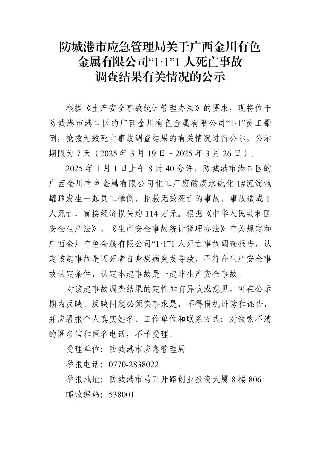 防城港市应急管理局关于广西金川有色金属有限公司“1·1”1人死亡事故调查结果有关情况的公示