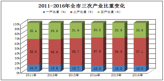 全市第一产业增加值80.8亿元,增长3.9%;第二产业增加值386.3亿元,增长11.5%;第三产业增加值209亿元,增长6.6%。三次产业比例由上年的12.2:56.9:30.9调整为12.0:57.1:30.9,第一产业比重下降0.2个百分点,第二产业比重上升0.2个百分点,第三产业比重与上年持平。
