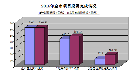 项目建设工作卓有成效。“边海经济带”项目计划顺利实施,全年完成投资458.2亿元,超额完成年度投资计划任务;纳入自治区统筹推进的23个重大项目完成投资161亿元,完成年度投资计划的165.1%。一批重大项目顺利推进,防城港红沙核电项目一期工程2号机组正式商运,二期3、4号机组开工建设,钢铁基地冷轧产品顺利下线,防城港电厂二期、盛隆焦化二期、枫叶粮油二期项目投产;日加工500吨膨化大豆粉、20万吨精炼植物油等项目竣工试产;中海油广西LNG储运、科元化工等项目全面加快建设;通用机场、铁路公路、港口码头等一批重大项目前期工作加快开展。国家、自治区各领域专项补助资金申报工作扎实开展,获批国家专项建设基金项目25个,额度7.81亿元,成功申报中央预算内投资项目108个,获得上级支持资金4.6亿元。项目征地工作成效显著,全市完成征地面积1.65万亩,新增建设用地、用海指标1.78万亩。