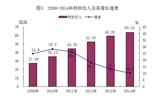全年财政收入65.33亿元,增长10.2%。其中,税收收入48.0亿元,增长12.9%;非税收收入17.33亿元,增长3.5%。公共财政预算收入45.45亿元,增长11.6%。公共财政预算支出97.52亿元,增长10.2%。其中,城乡社区事务支出增长106.7%,社会保障和就业支出增长37.7%,住房保障支出增长33.9%,节能环保支出增长19.1%,教育支出增长9.0%,文化体育与传媒支出增长4.6%,科学技术支出下降8.3%,医疗卫生与计划生育支出下降3.9%,农林水事务支出下降7.9%。