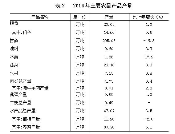 全年农作物总播种面积123.89千公顷,比上年减少0.7千公顷。其中,粮食种植面积49.94千公顷,减少0.11千公顷;油料种植面积3.02千公顷,增加0.19千公顷;甘蔗种植面积46.69千公顷,减少1.98千公顷;蔬菜种植面积21.17千公顷,增加0.89千公顷。年末果园面积10.78千公顷,减少0.1千公顷。全年粮食总产量20.05万吨,增长1.0%;甘蔗产量295.05万吨,减少57.36万吨;油料产量0.60万吨,增长3.9%;水果产量7.15万吨,增长6.8%;蔬菜产量26.18万吨,增长3.6%。