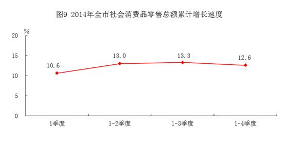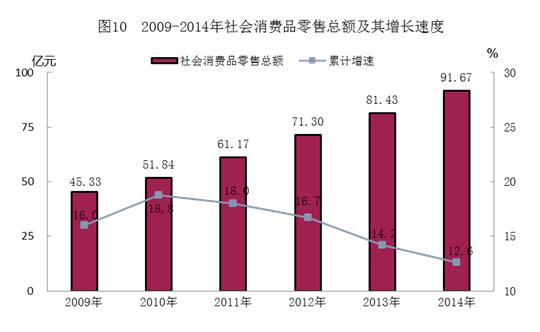 全年实现社会消费品零售总额91.67亿元,增长12.6%,扣除价格因素,实际增长11.0%。按经营地统计,城镇消费品零售额81.75亿元,增长12.6%;乡村消费品零售额9.91亿元,增长12.2%。