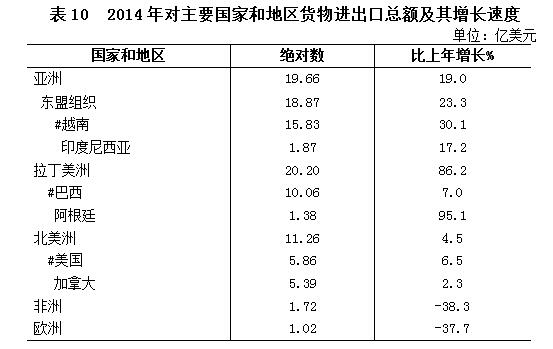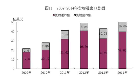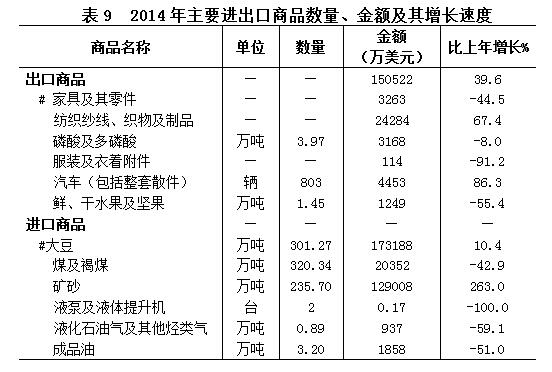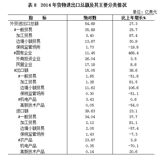 据海关统计,全年货物进出口总额54.69亿美元,增长27.3%,其中,进口总额39.63亿美元,增长23.1%;出口总额15.05亿美元,增长39.6%。外贸进出口规模在全区排第2位,其中进口占全区进口总量的24.4%,稳居全区首位。全年边贸成交额273.51亿元,增长13.3%,其中,进口147.78亿元,增长5.3%;出口125.73亿元,增长24.3%。