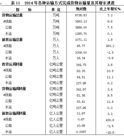 全年交通运输、仓储及邮政业实现增加值46.06亿元,增长1.3%。全年客货运周转量344.75亿吨公里,增长3.6%。其中,货物运输总量1.47亿吨,增长7.8%;旅客运输总量2700万人,增长6.3%。