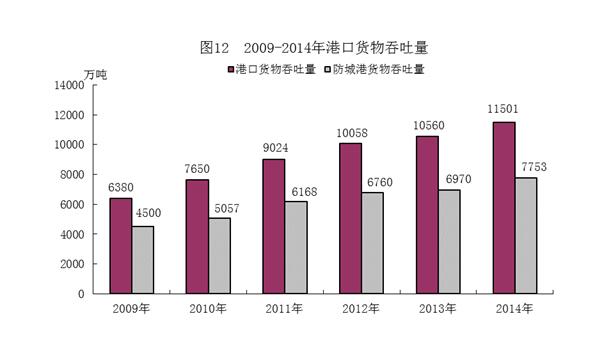 全年港口货物吞吐量11501万吨,增长8.9%,其中集装箱吞吐量完成32.20万标准箱,增长3.9%。从全年各季度来看,一季度完成2686万吨,增长11.6%;二季度完成3069万吨,增长22.2%;三季度完成2862万吨,增长8.5%;四季度完成2883万吨,下降4.0%。从货物贸易方式看,外贸货物吞吐量8896万吨,增长11.5%;内贸货物吞吐量2604万吨,增长0.9%。从吞吐方式看,进口8624万吨,增长13.6%;出口2877万吨,下降3.1%。从港口规模来看,防城港完成货物吞吐量7753万吨,占全市吞吐量68.7%,实现增长1.4%;中小港完成吞吐量3605万吨,占全市吞吐量31.3%。从商品主要种类看,完成吞吐量前六位货种分别为煤炭及制品4456万吨,金属矿石3246万吨,化工原料及制品551万吨,粮食516万吨,农林牧渔产品462万吨,化肥及农药401万吨,其中煤炭和金属矿石两大货种的吞吐量占全市吞吐量67.0%,比上年提高0.8个百分点。