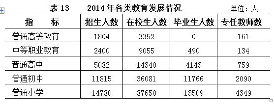 全年普通高等教育招生1804人,在校生3352人。各类中等职业教育招生2400人,在校生9055人,毕业生490人。普通高中招生5082人,在校生14340人,毕业生4143人。普通初中招生11815人,在校生36081人,毕业生11766人。普通小学招生14780人,在校生87650人,毕业生13509人。幼儿园在园儿童34502人。全市普通高考本科上线2427人、专科上线4339人,本专科录取率93.7%。