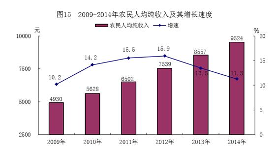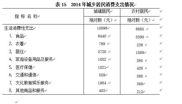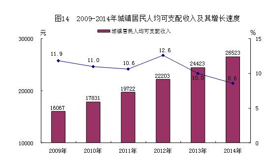 全年城镇居民人均可支配收入26523元,增长8.6%,扣除价格因素,实际增长6.4%;农村居民人均纯收入9524元,增长11.3%,扣除价格因素,实际增长9.2%。城镇居民人均生活消费支出15896元,增长7.5%,扣除价格因素,实际增长5.3%;农村居民人均生活消费支出6685元,增长12.3%,扣除价格因素,实际增长10.2%。城镇居民食品消费支出占消费总支出的比重为40.5%,农村居民家庭食品消费支出占消费总支出的比重为50.7%。