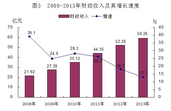 全年财政收入59.26亿元,增长13.1%。其中,税收收入42.52亿元,增长16.2%;非税收收入16.74亿元,增长6.1%。公共财政预算收入40.71亿元,增长14.5%。公共财政预算支出88.48亿元,增长18.4%。其中,科学技术支出增长73.1%,文化体育与传媒支出增长66.9%,医疗卫生支出增长20.7%,社会保障和就业支出增长13.8%,教育支出下降14.9%,农林水事务支出下降2.3%,住房保障支出下降5.7%。