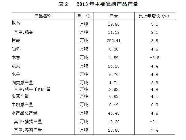 全年农作物总播种面积124.58千公顷,比上年增加3.05千公顷。其中:粮食种植面积50.04千公顷,增加0.98千公顷,其中谷物、豆类、薯类种植面积分别为40.82千公顷、1.61千公顷、7.61千公顷,分别增加0.65千公顷、0.06千公顷、0.27千公顷;经济作物种植面积53.57千公顷,增加1.52千公顷,其中油料种植面积2.83千公顷,增加0.14千公顷;甘蔗种植面积48.67千公顷,增加1.56千公顷;蔬菜种植面积20.28千公顷,增加0.53千公顷。年末果园面积10.89千公顷,增加0.36千公顷。全年粮食总产量19.86万吨,增长3.1%;甘蔗产量352.41万吨,增长3.5%;油料产量0.58万吨,增长4.6%;水果产量6.70万吨,增长4.8%;蔬菜产量25.28万吨,增长4.4%。