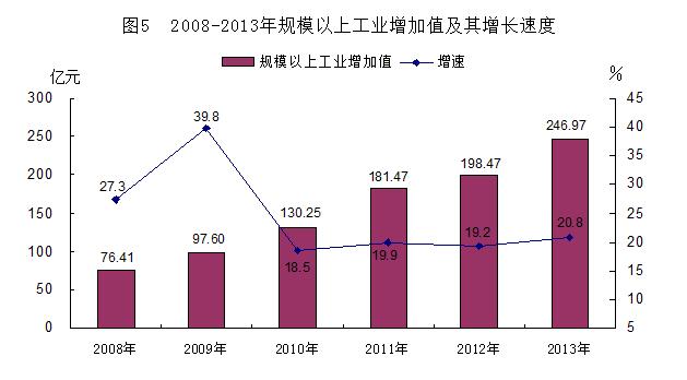规模以上工业中,从轻重工业看,轻工业增加值108.94亿元,增长11.3%;重工业增加值138.03亿元,增长30.6%,轻重工业实现增加值分别占规模以上工业增加值的44.1%和55.9%,对规模以上工业增加值增长的贡献率分别达27.5%、72.5%,分别拉动规模以上工业增加值增长5.7个百分点、15.1个百分点。