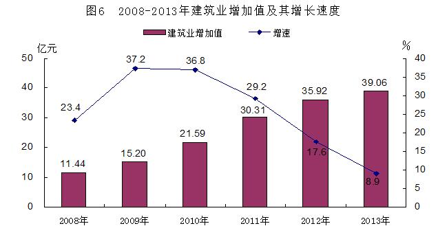 全年全社会建筑业实现增加值39.06亿元,增长8.9%。具有资质等级的总承包和专业承包建筑业企业47家,全年完成建筑业总产值74.57亿元,增长4.0%;房屋建筑施工面积409.24万平方米,增长18.9%;房屋建筑竣工面积231.87万平方米,下降1.0%。